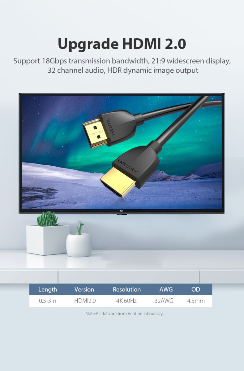 Модернізований кабель HDMI Vention дозволяє підключати пристрої HDMI (наприклад, ПК, ноутбук або PS4) до монітора, дисплею, проектора, телевізора високої чіткості для передачі відео і звуку.
