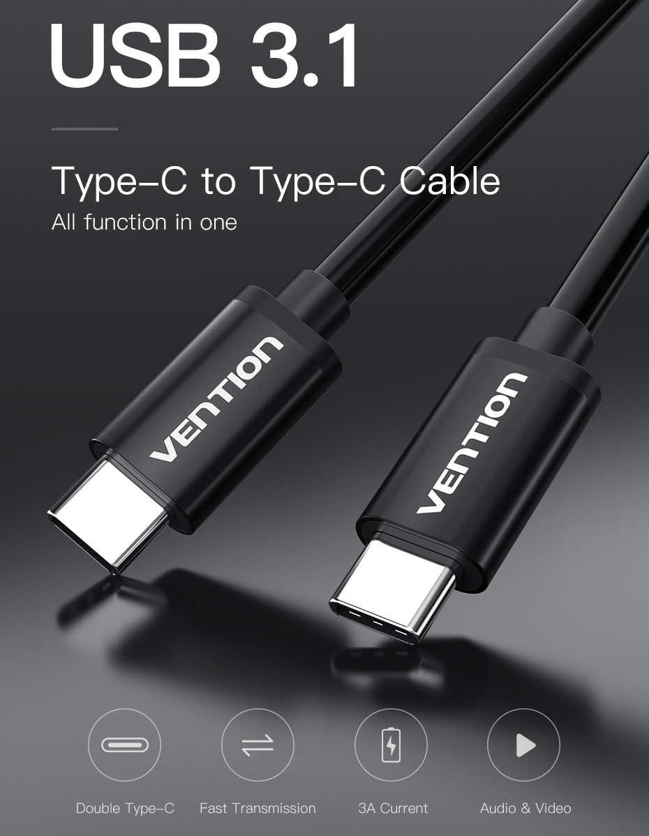 Кабель Type-C-Type-C 3.1 Vention PVC Shell Thunderbolt 3 4K 60Hz PD 60W 3A 5Gbps nickel-plated 1m Black
